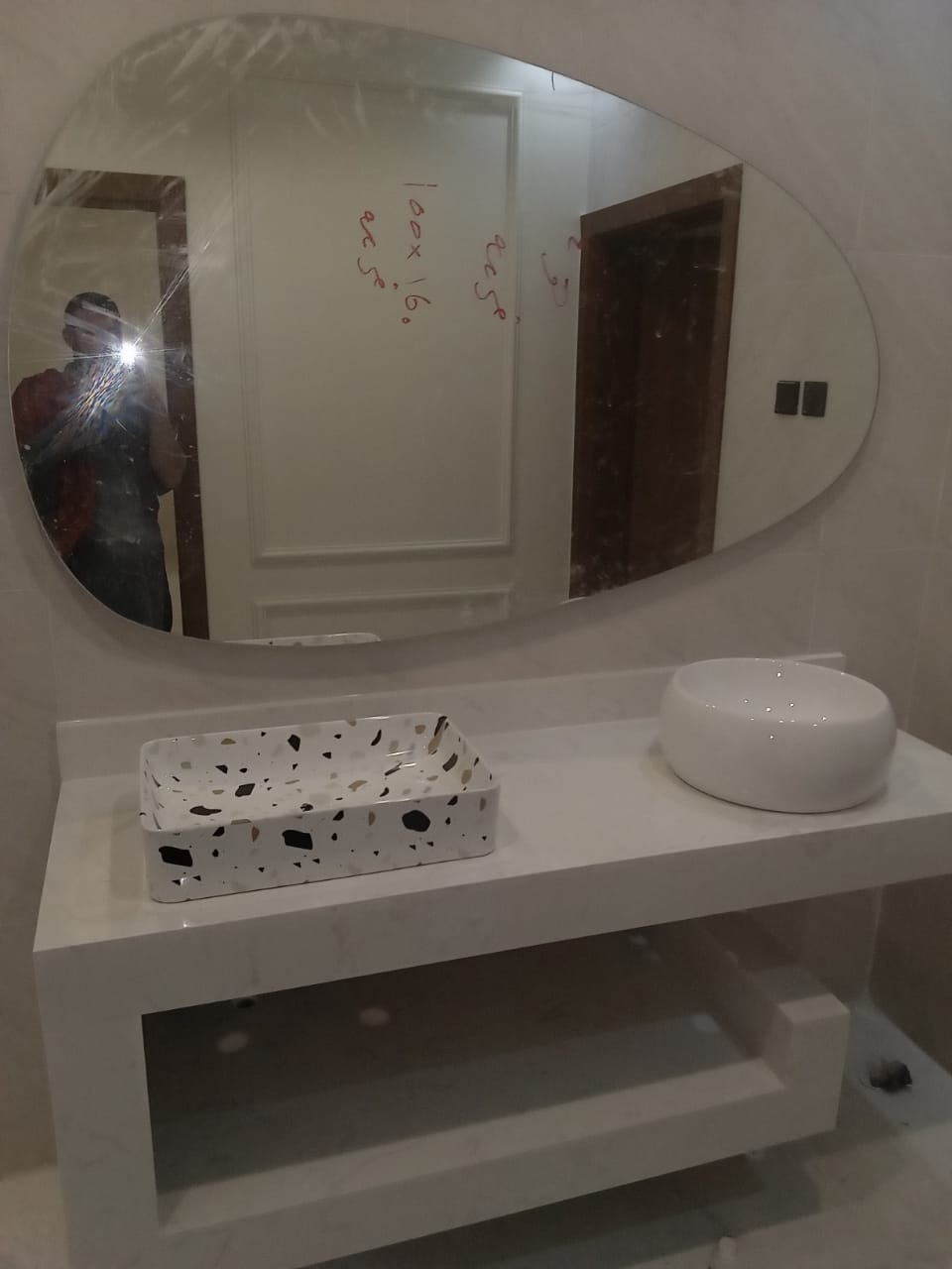 • المرايا: اختيار مرايا عصرية أو كلاسيكية أنيقة ذات إطارات متناسقة مع الرخام يكمل المشهد الجمالي للمغسلة.