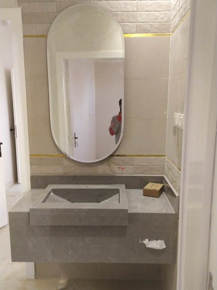 القطع والتفصيل الدقيق: يتم تفصيل ألواح الرخام بدقة عالية حسب أبعاد المغسلة المرغوبة، باستخدام مناشير متقدمة تضمن حواف ناعمة ومتساوية.